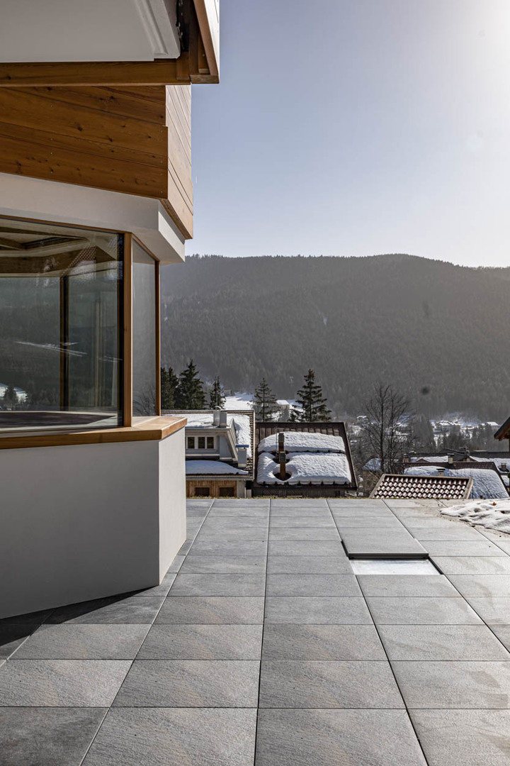 The large windows flood the spaces with natural light, evoking a suggestive and relaxing atmosphere. The structure is characterized by two large bow windows which, with their protrusions, offer an all-encompassing view of the surrounding mountains. Glass is the protagonist not only in the windows, but also in the spacious terrace of the front facade, since the parapet has been specially arranged in transparency to lighten the volumes and not obscure the view. A perfect cohesion between wood, the predominant element that characterizes the entire structure and typical of mountain houses, and the sophisticated and modern style that make the villa unique in its kind.