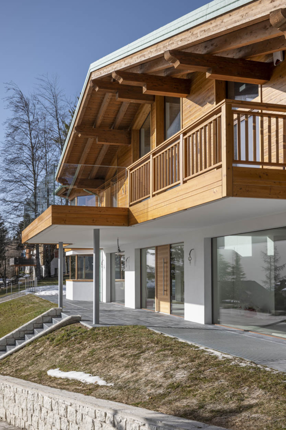 The result is extremely elegant and homogeneous and the villa as a whole represents a perfect combination of technologies and rustic elements typical of mountain chalets.