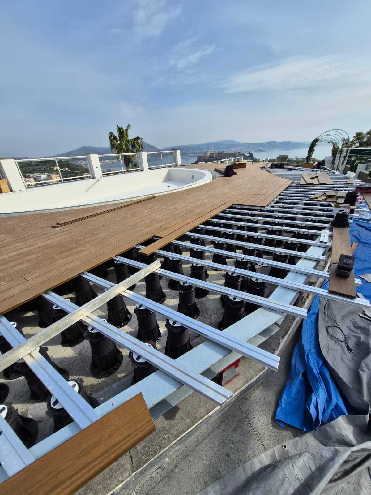 Woodeck technology and design vision for a suspended pool edge overlooking the Gulf of Pozzuoli