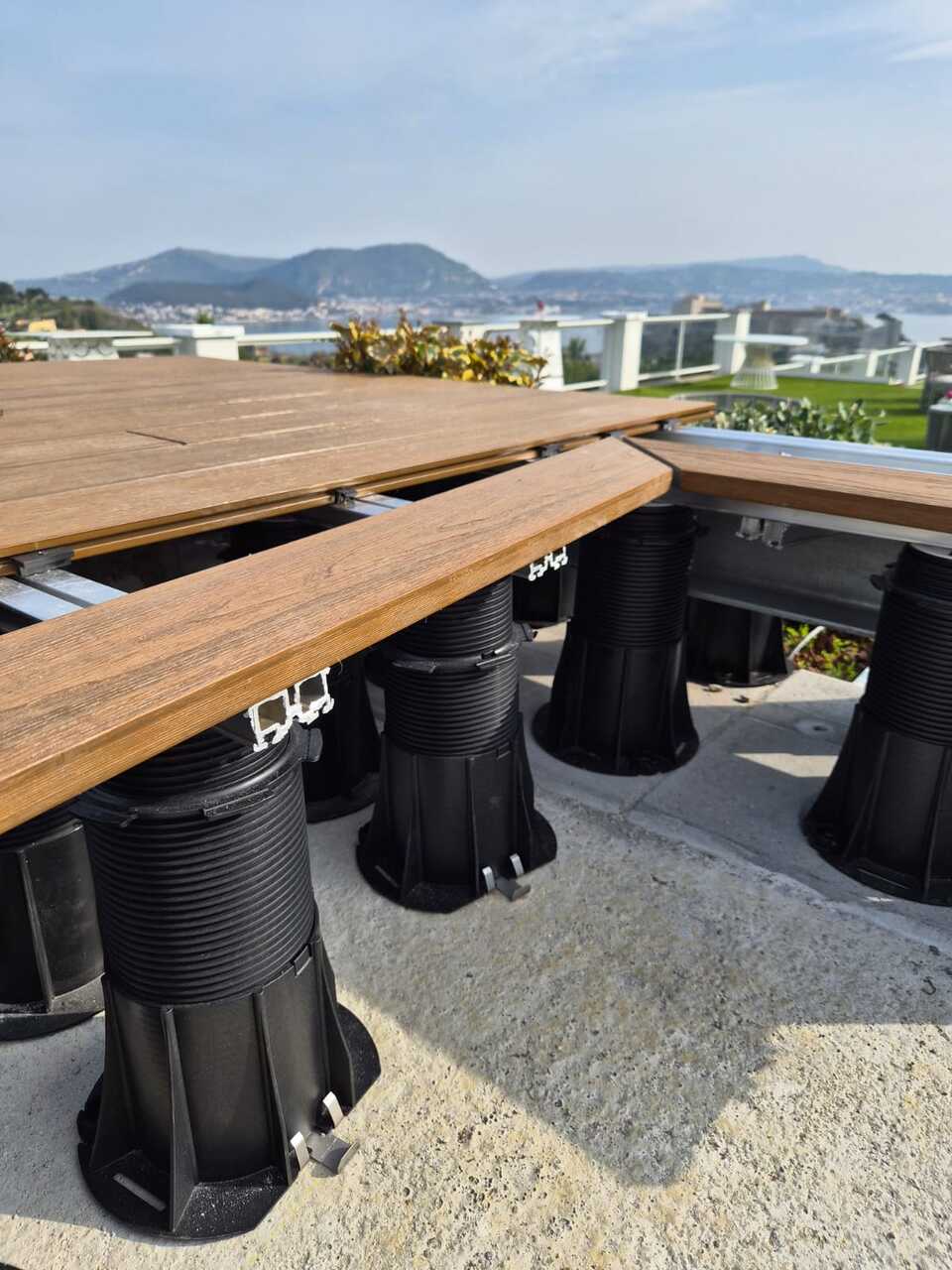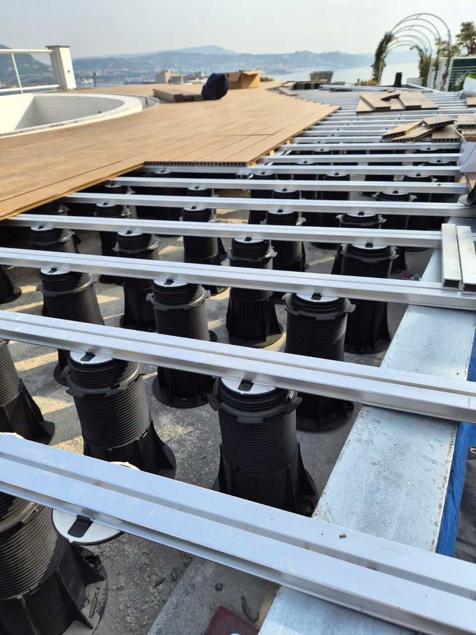 • 594 PR3 pedestals (155–420 mm), strategically distributed as follows: 409 internal pedestals to ensure solidity and surface uniformity, and 185 perimeter pedestals designed to precisely define the edge and enhance the architectural layout